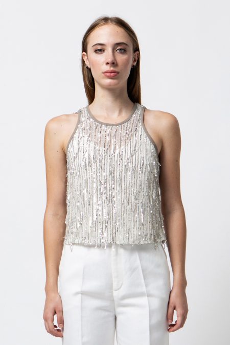 Top in tessuto paillettes off-white