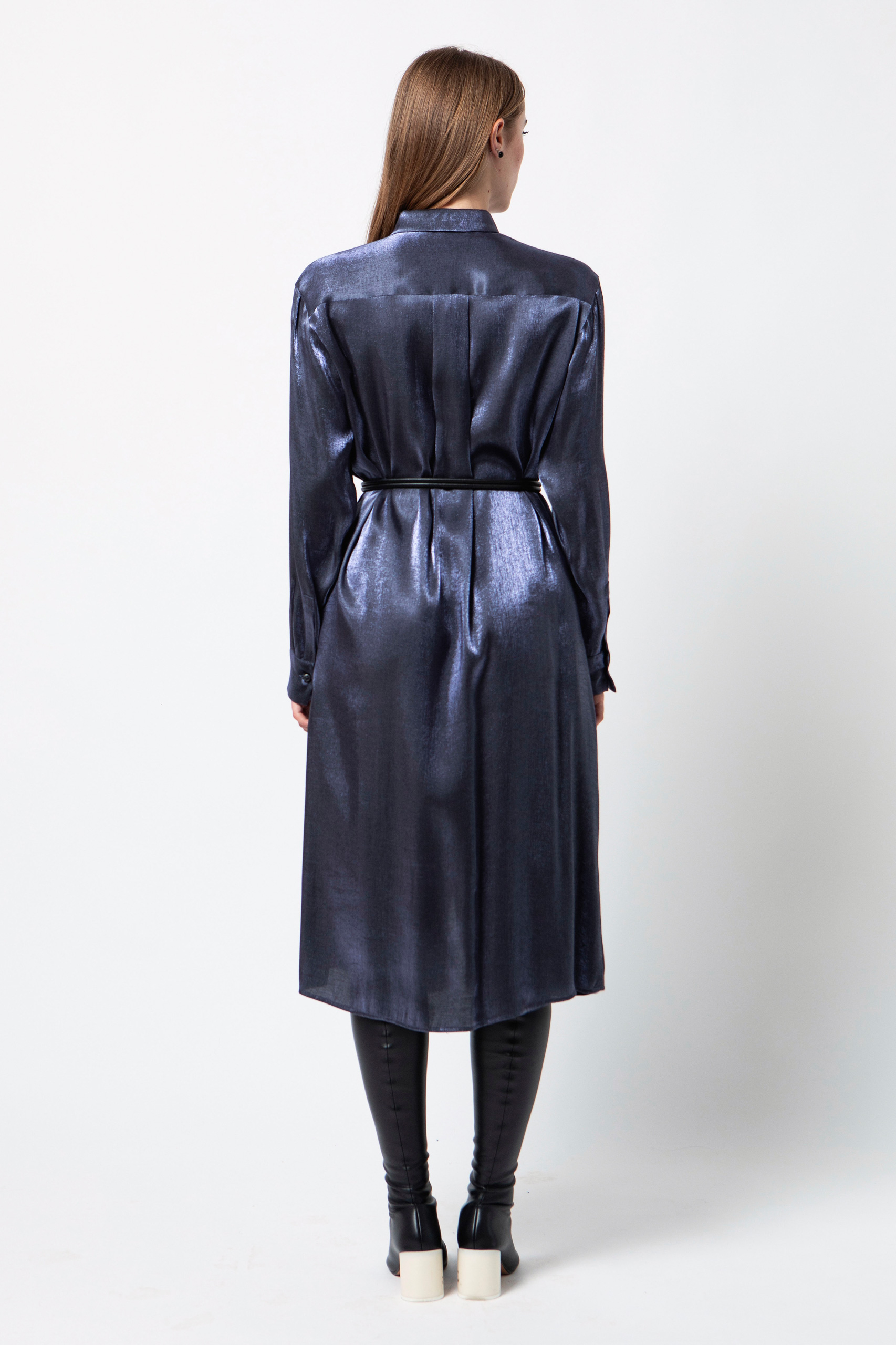 Fascino contemporaneo e minimale per questo abito chemisier midi dal taglio essenziale. Femminile e dalle linee pulite è caratterizzato da un raffinato raso di viscosa che anima la silhouette morbida dalle linee leggermente svasate. Dotato di cinturino tubolare di pelle.