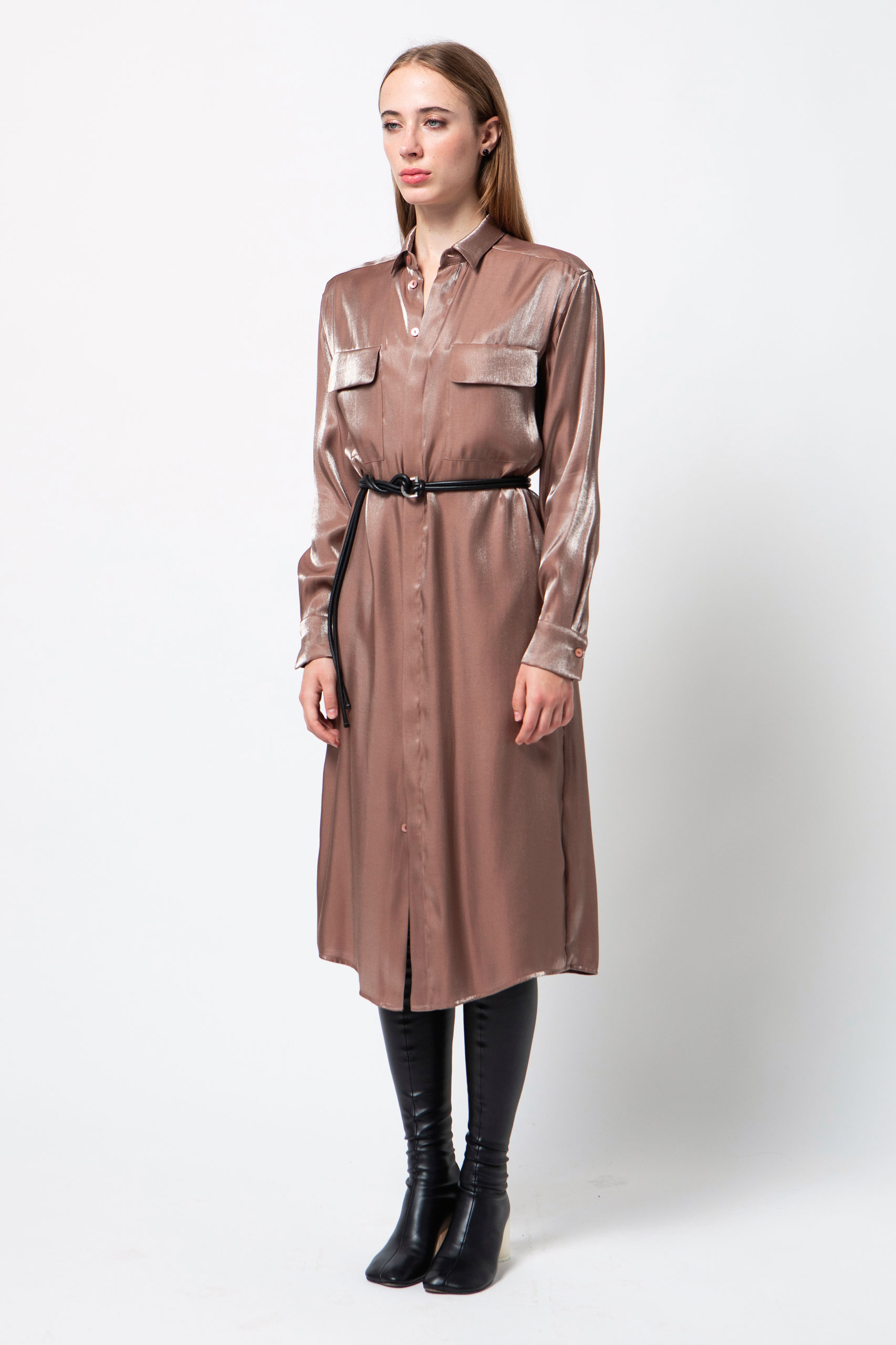 Fascino contemporaneo e minimale per questo abito chemisier midi dal taglio essenziale. Femminile e dalle linee pulite è caratterizzato da un raffinato raso di viscosa che anima la silhouette morbida dalle linee leggermente svasate. Dotato di cinturino tubolare di pelle.