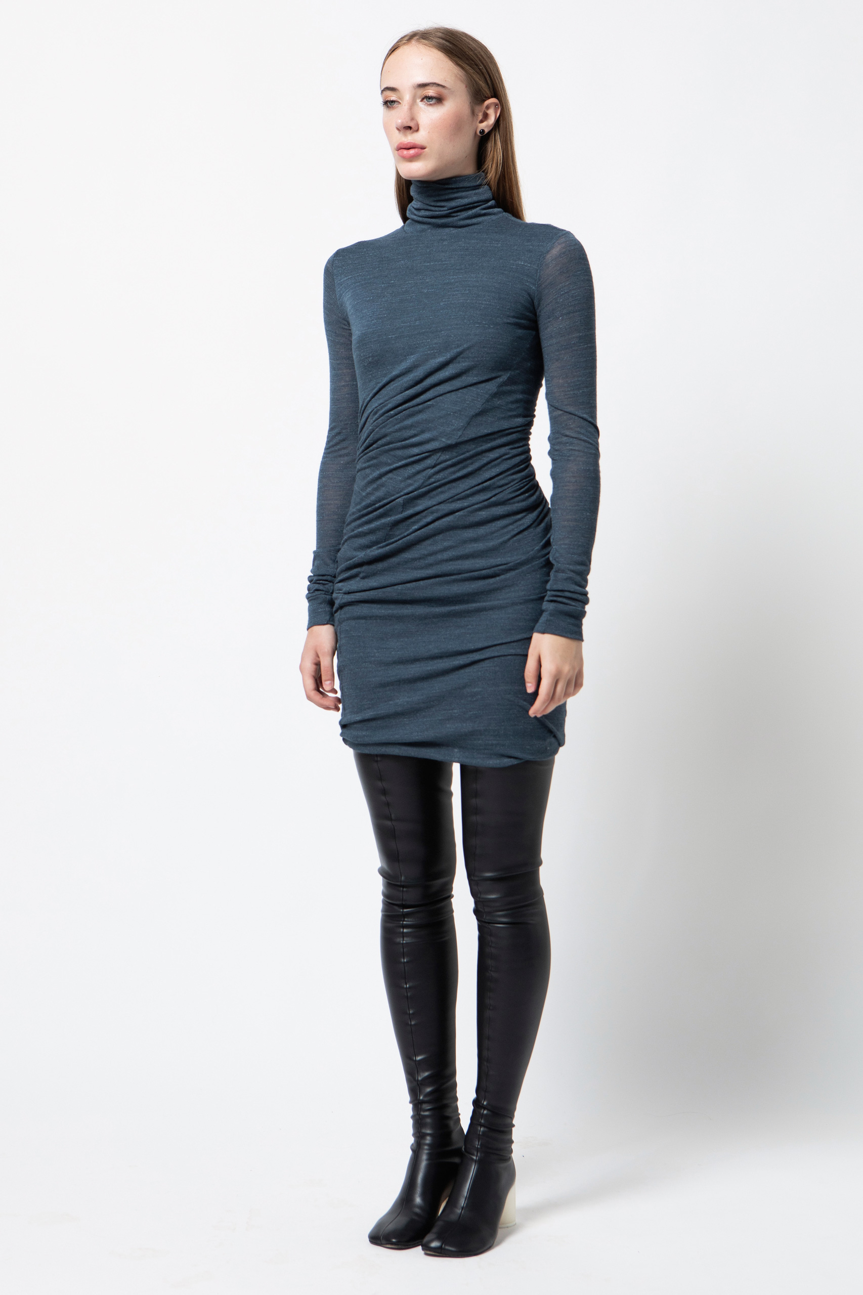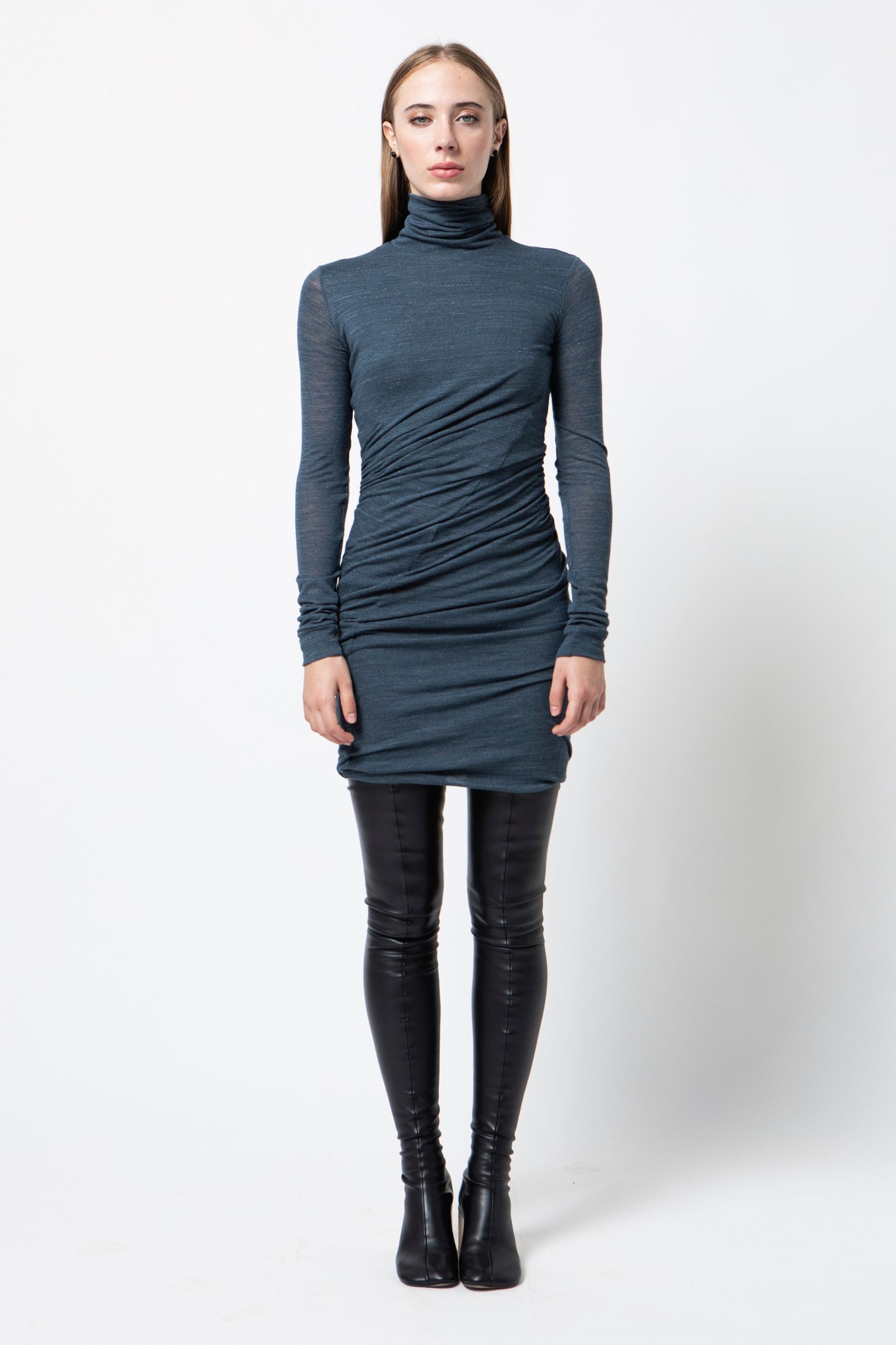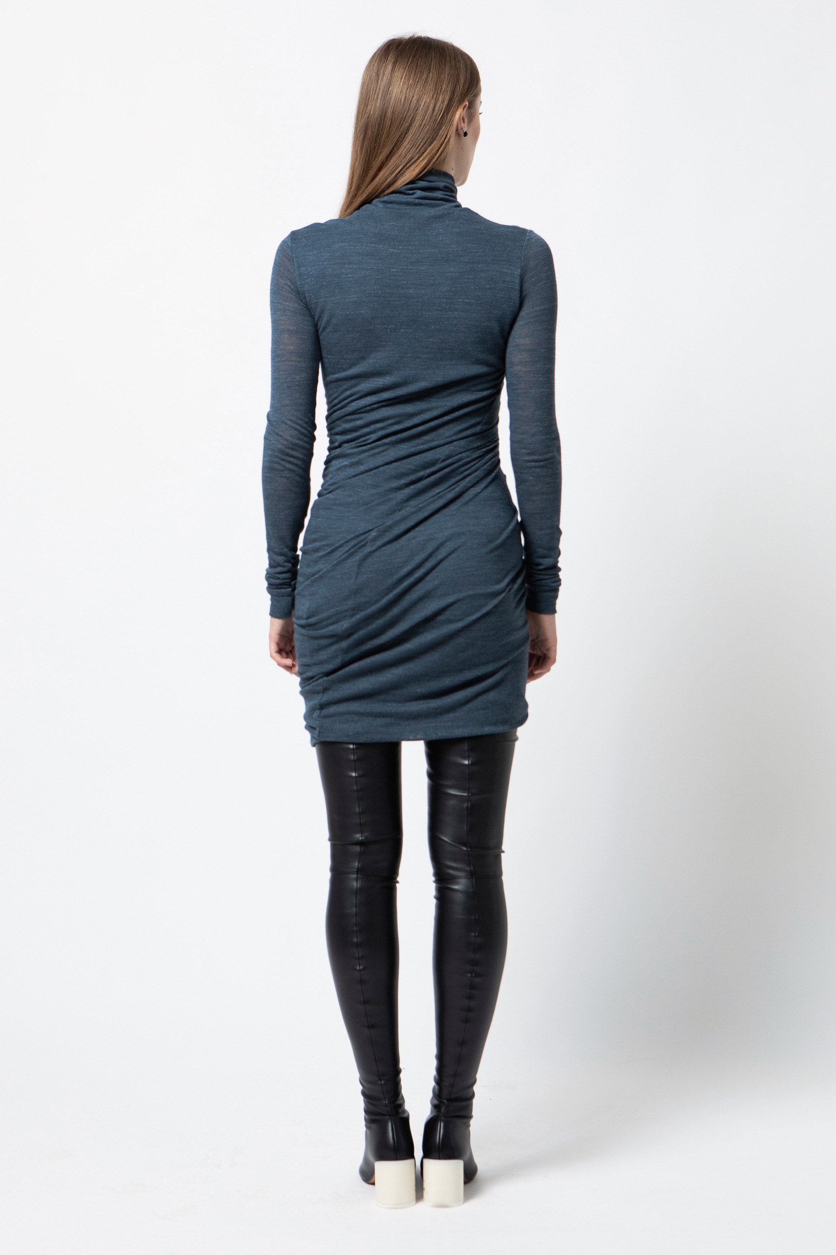 Minimalismo con un twist per questo miniabito in jersey blue ocean. La forma avvolge la silhouette in uno stratto unico di tessuto doppiato elicoidale.