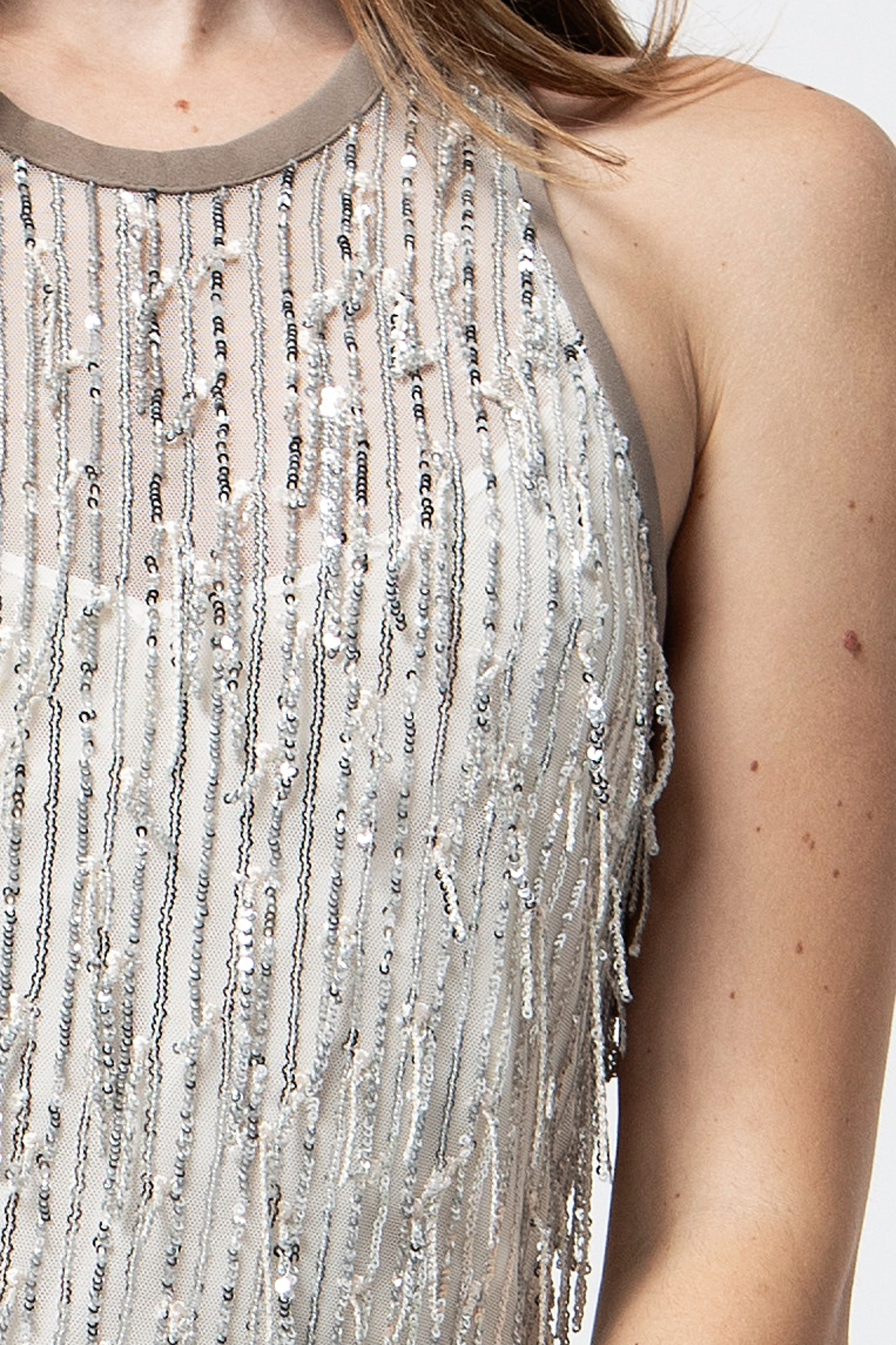 Abito in tessuto paillettes, dal design contemporaneo con scollo all’americana definito da un bordino in georgette di seta a contrasto e una silhouette leggermente svasata.