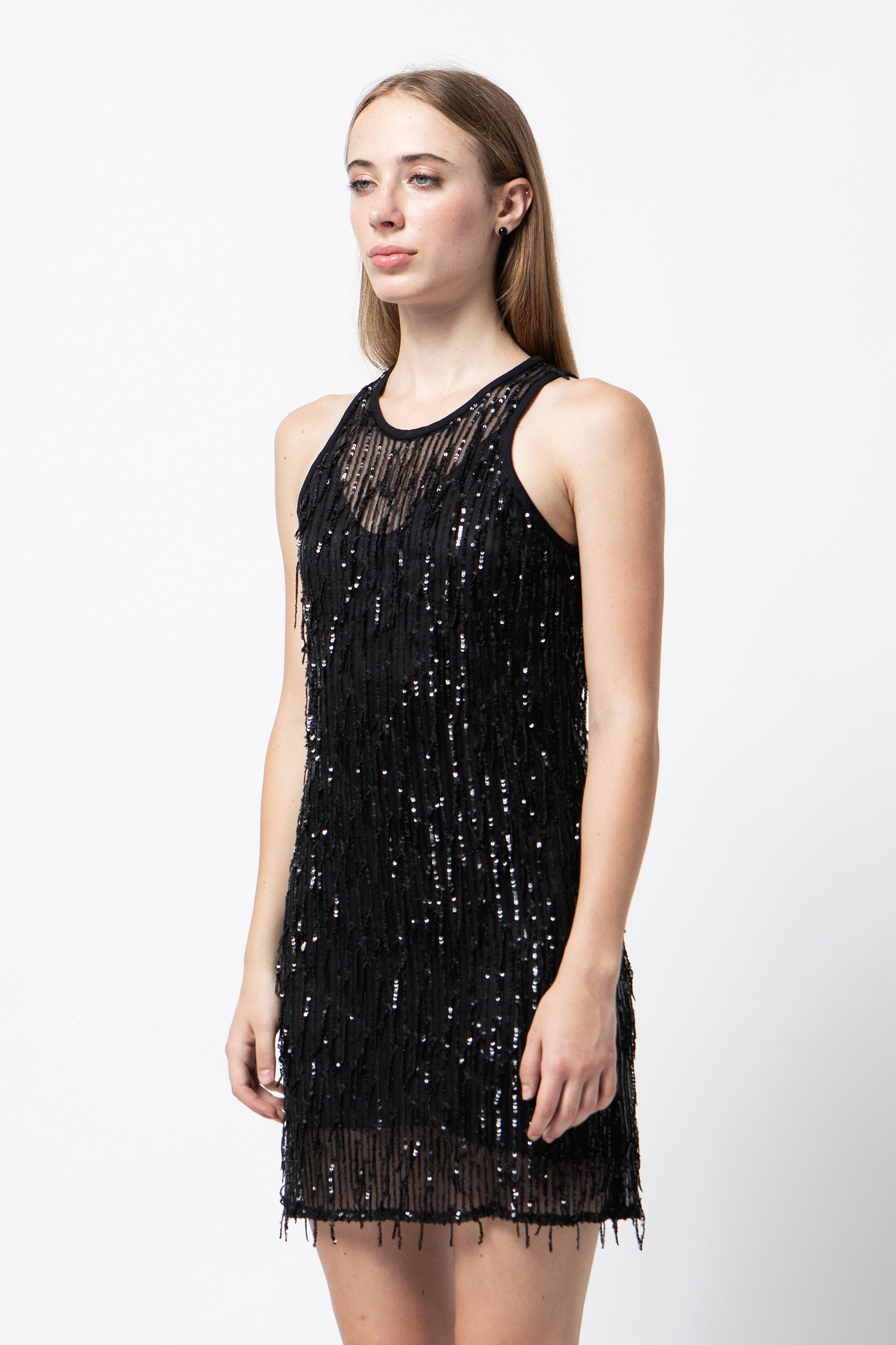 Abito in tessuto paillettes nero, dal design contemporaneo con scollo all’americana definito da un bordino in georgette di seta a contrasto e una silhouette leggermente svasata.