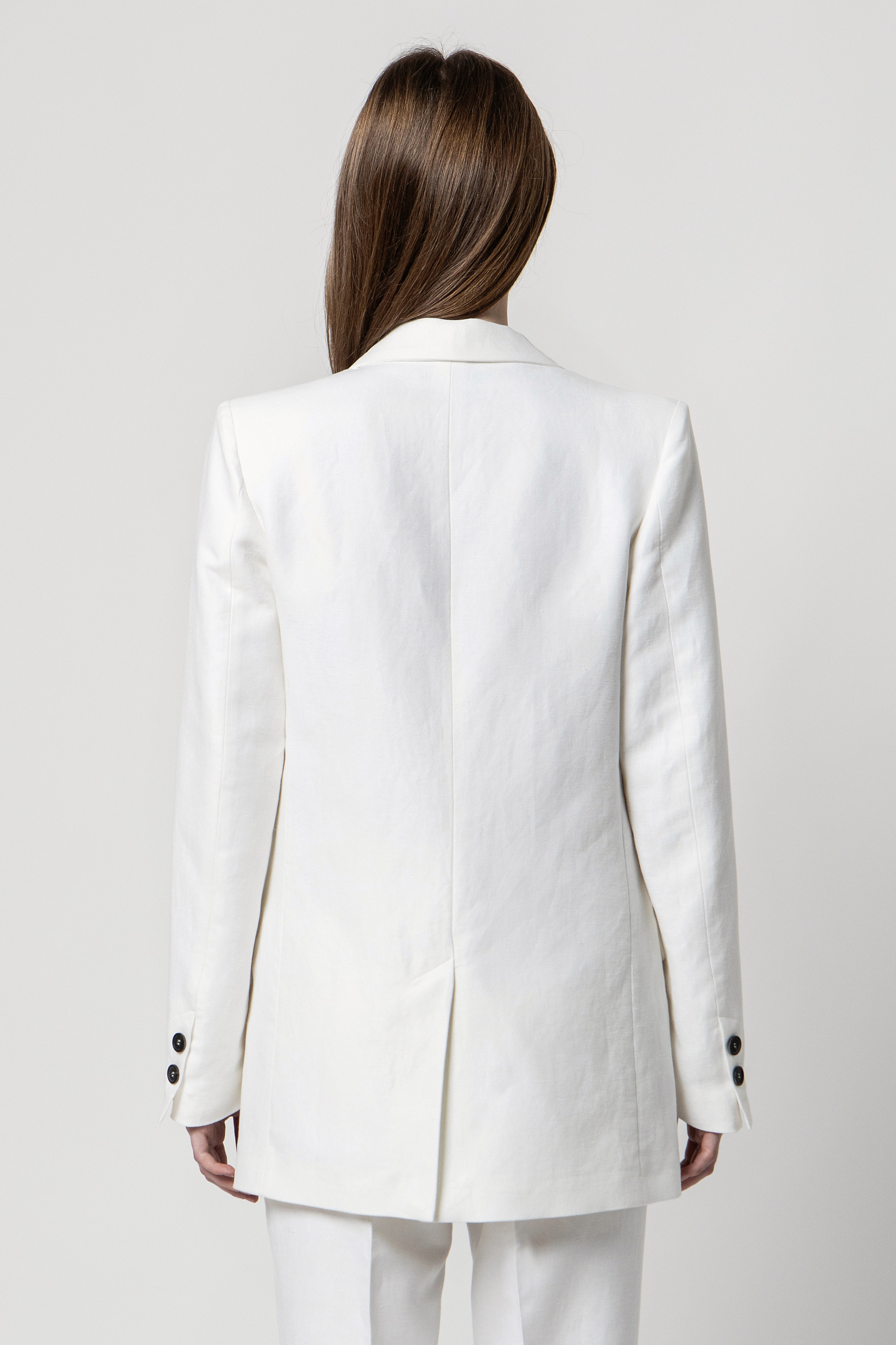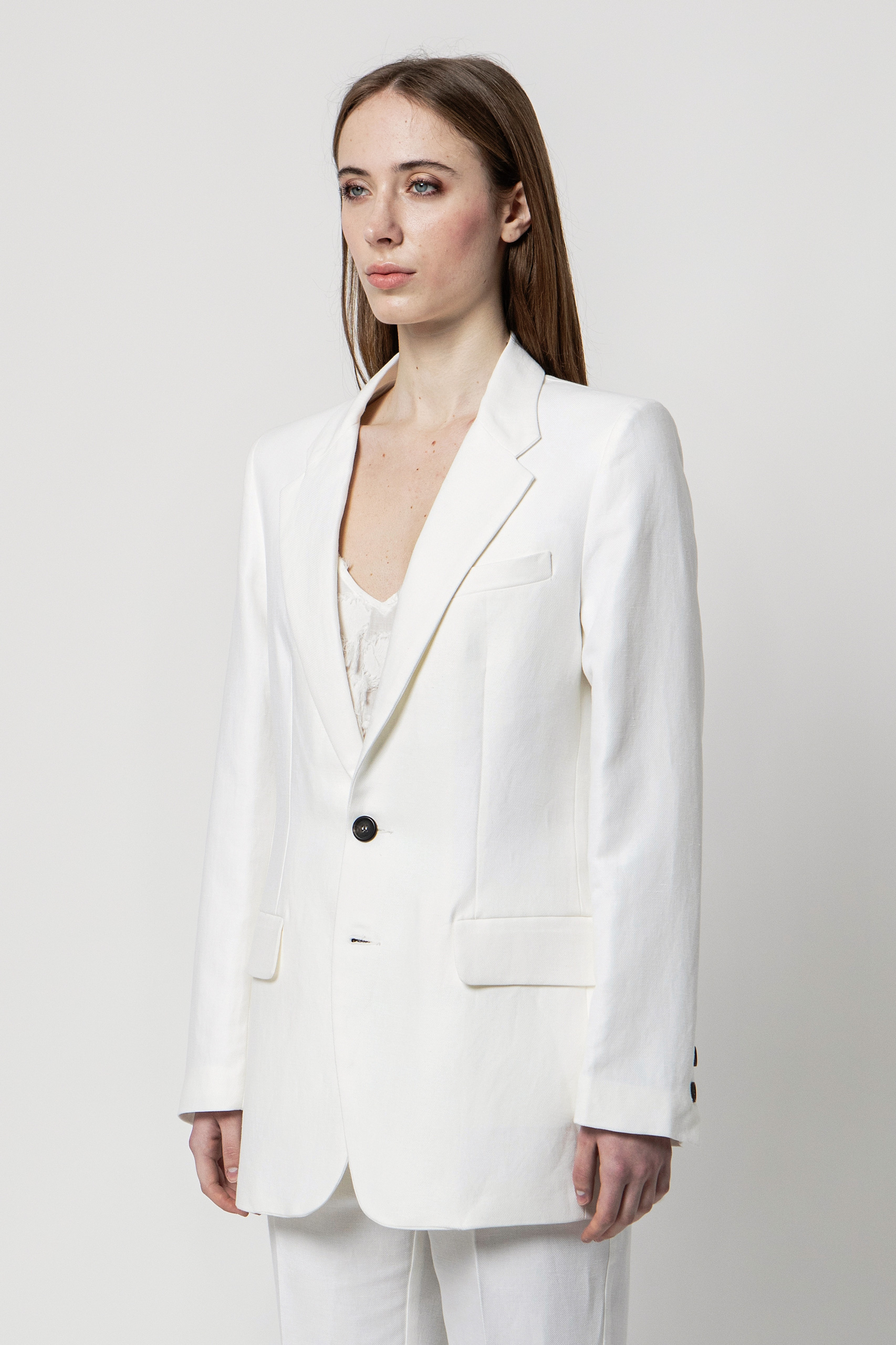 Questa giacca blazer dal taglio sartoriale è realizzata in un pregiatissimo tessuto twill di cotone e lino. La silhouette monopetto di ispirazione maschile e leggermente oversize è definita da linee decise, spacco sul retro e bottoni in corno a contrasto. La costruzione sartoriale le conferisce un’eleganza senza tempo.
