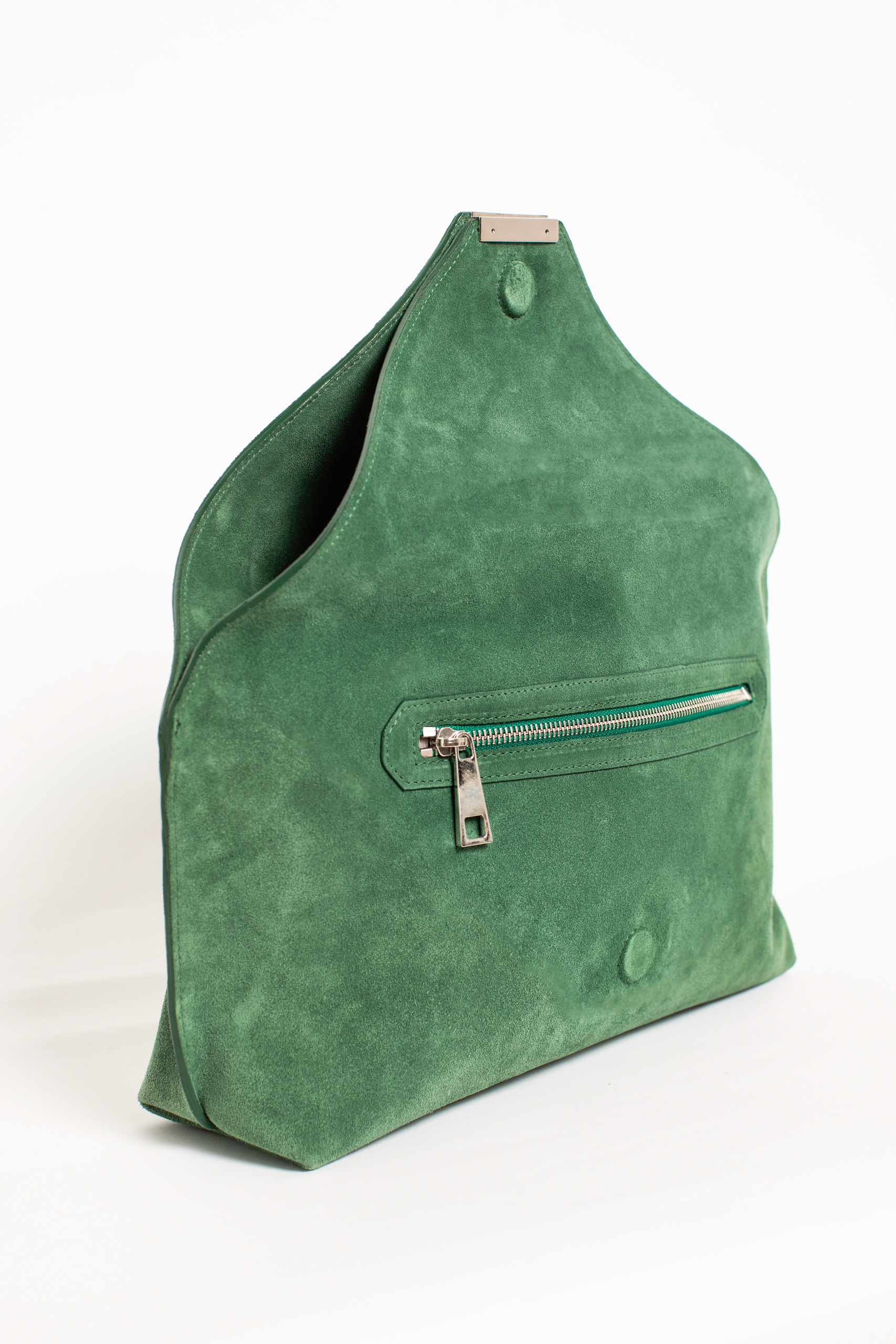 Allure sofisticata e carattere pragmatico per questa borsa a mano dalla silhouette oversize. Il modello, in pelle scamosciata, presenta linee essenziali e tagli grafici dal design minimalista e una tasca esterna con zip di metallo che la rende pratica ogni giorno.