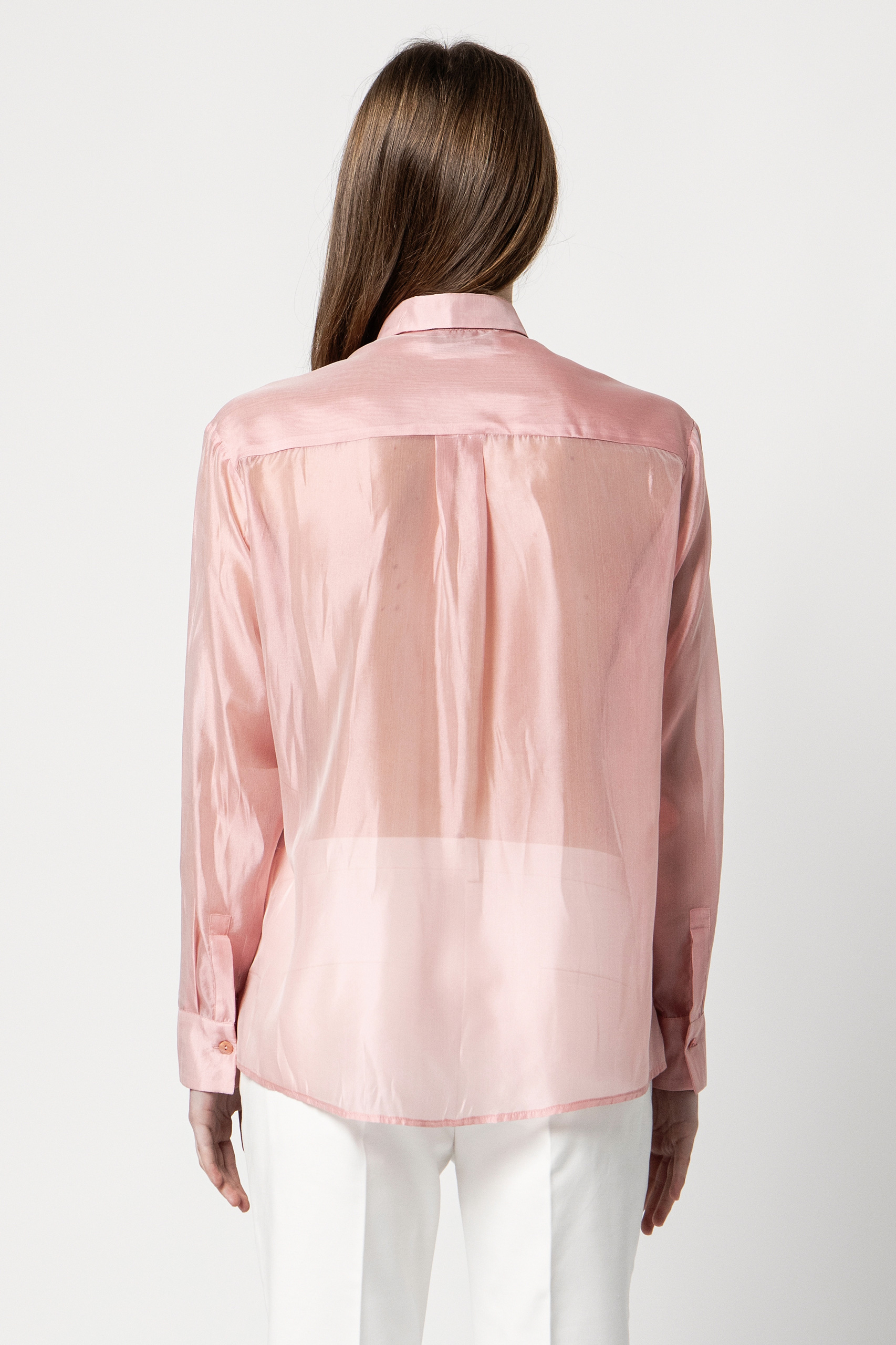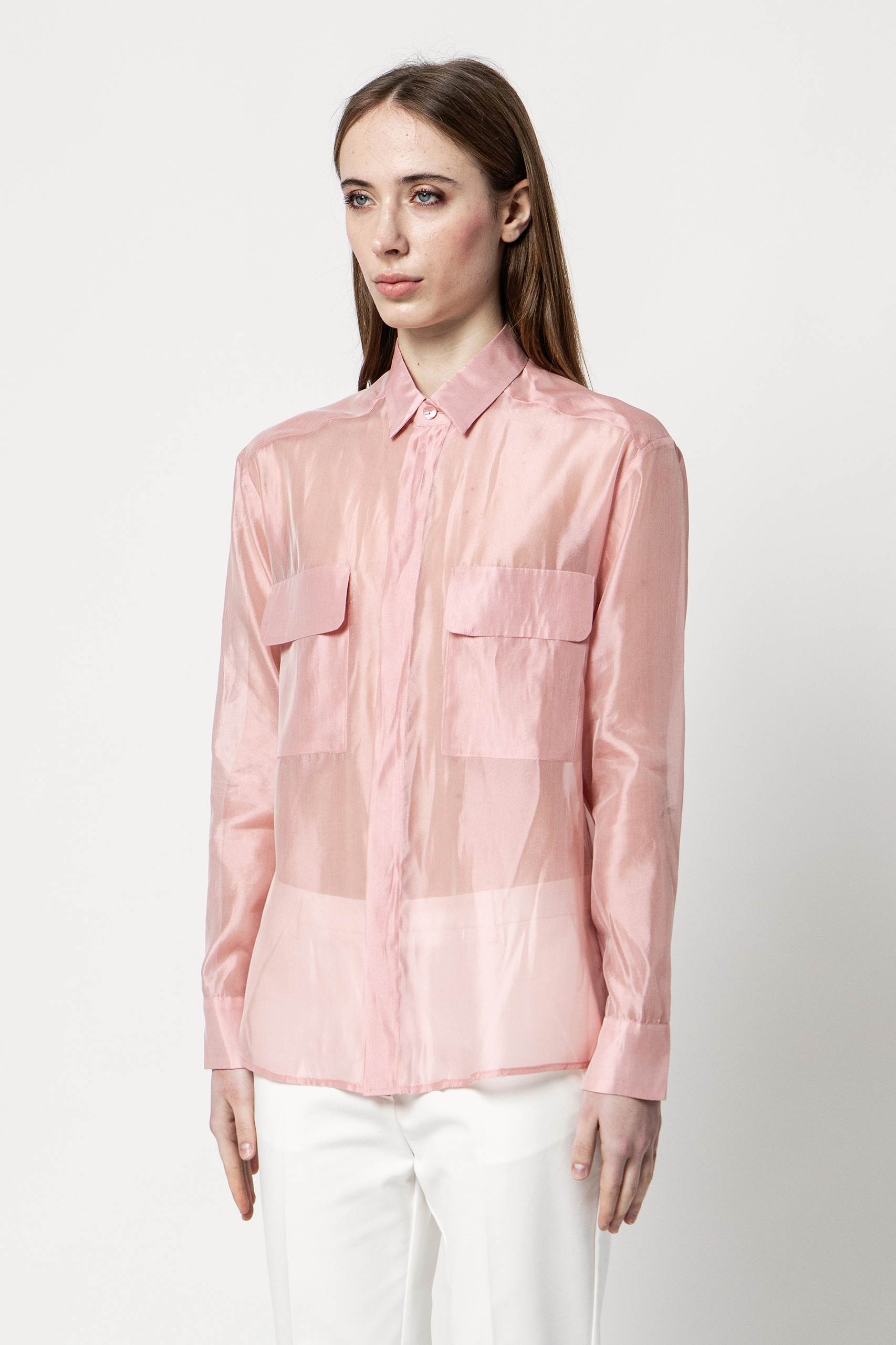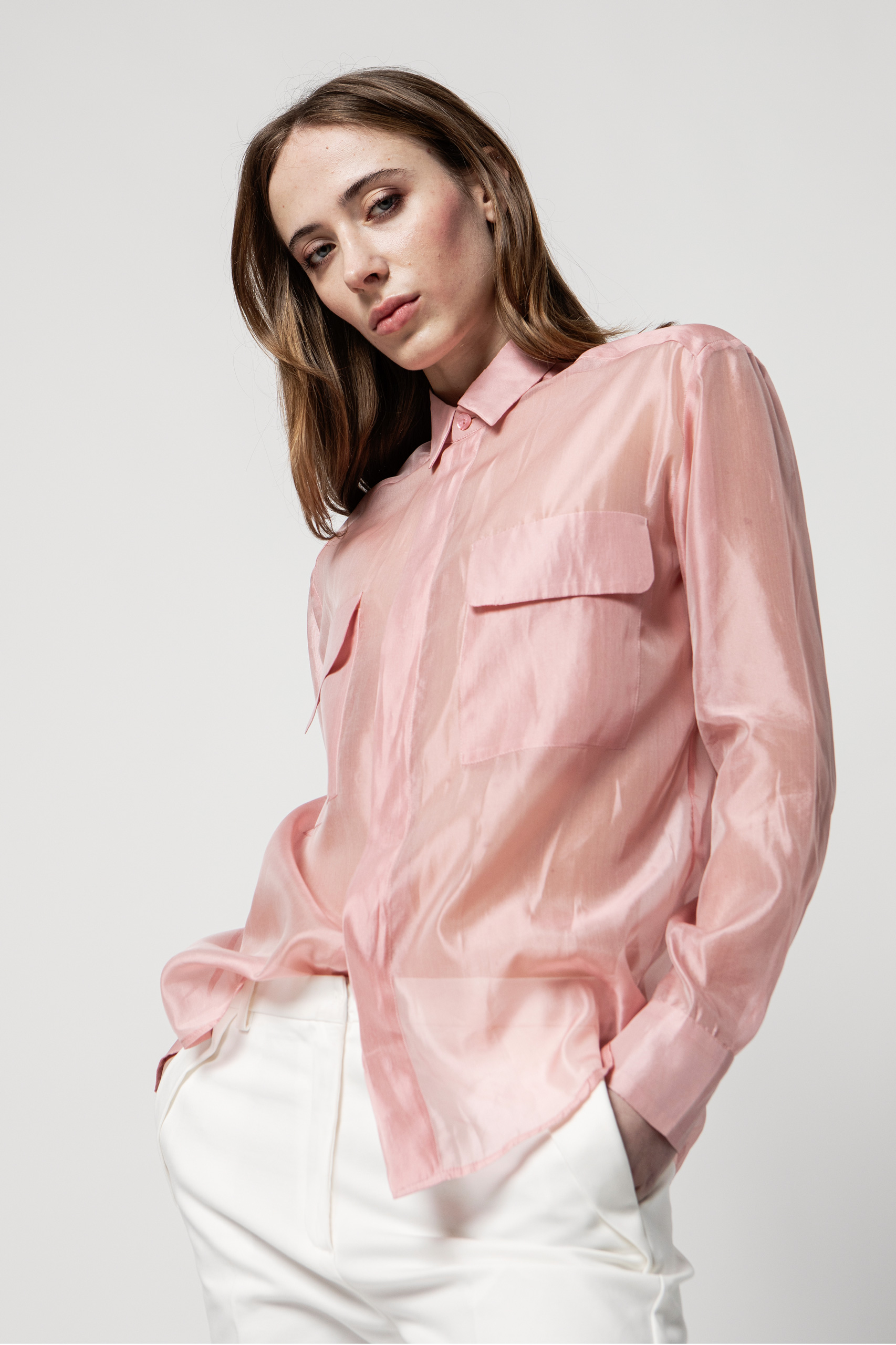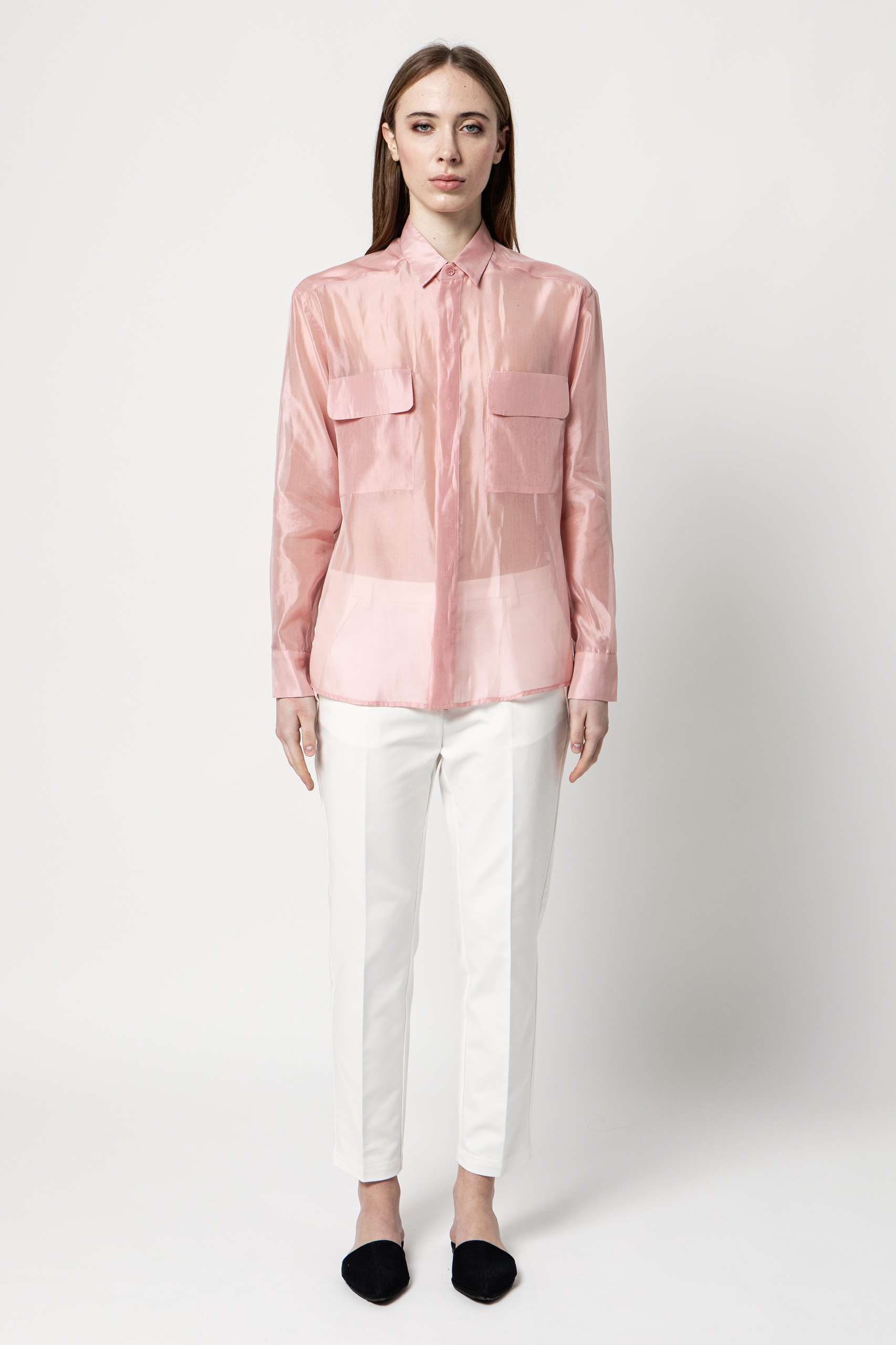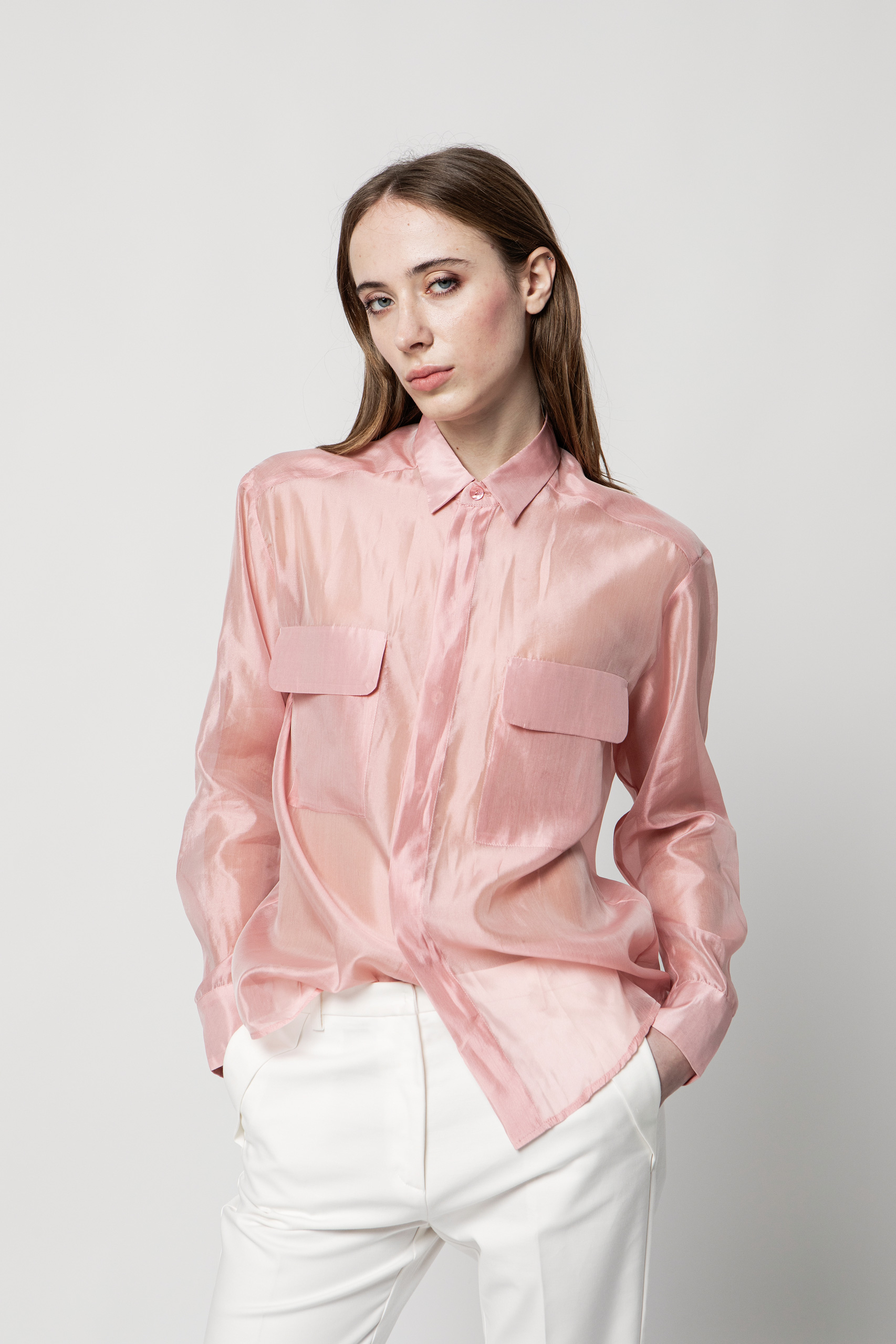 Camicia in organza di seta dalla linea fluida con effetto stropicciato e taglio d’ispirazione sartoriale maschile. La delicata trasparenza dell’organza le conferisce una discreta femminilità e dona al modello un’allure contemporanea e senza tempo.