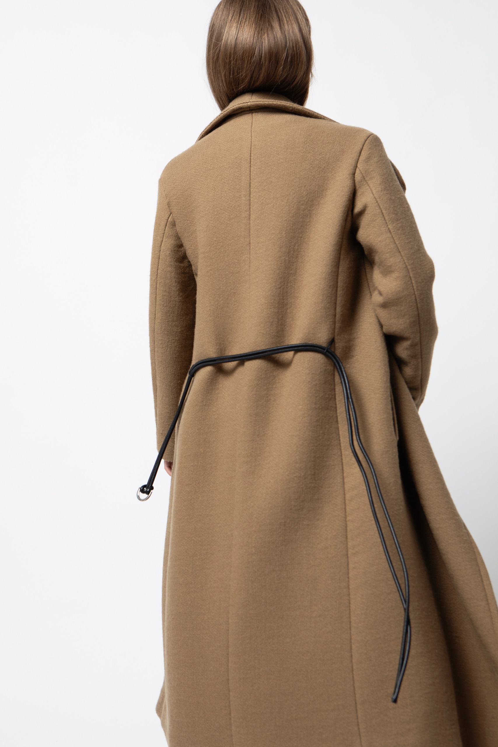 Questo cappotto in super twill di lana vergine si distingue per le linee morbide e avvolgenti che disegnano una silhouette doppiopetto a portafoglio. Il collo alto e il cinturino in tubolare di pelle per la chiusura gli donano un’eleganza effortless e senza tempo.