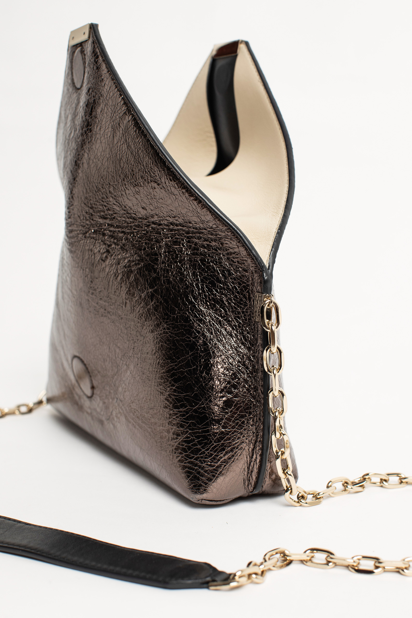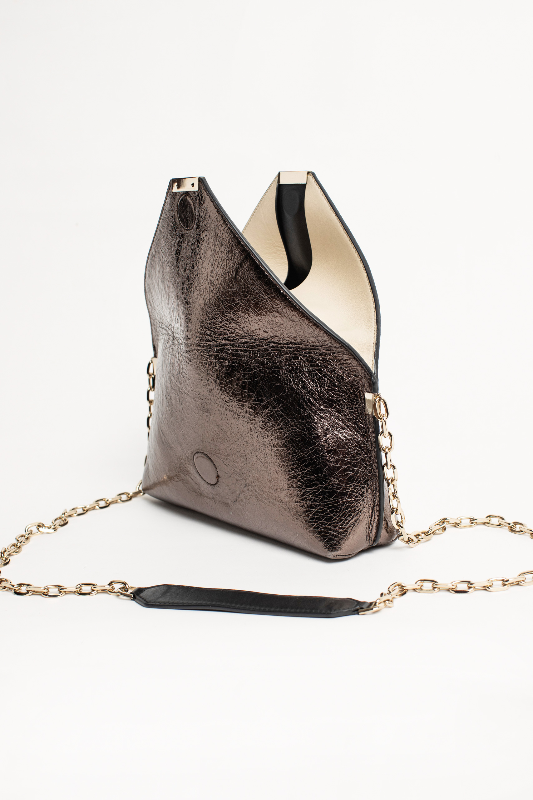 Borsa in mix di pellame dal design ispirato agli origami. Il tocco luminoso della catena tracolla e l’eleganza delle finiture color oro donano un’allure sofisticata e versatile a questa borsa mini.