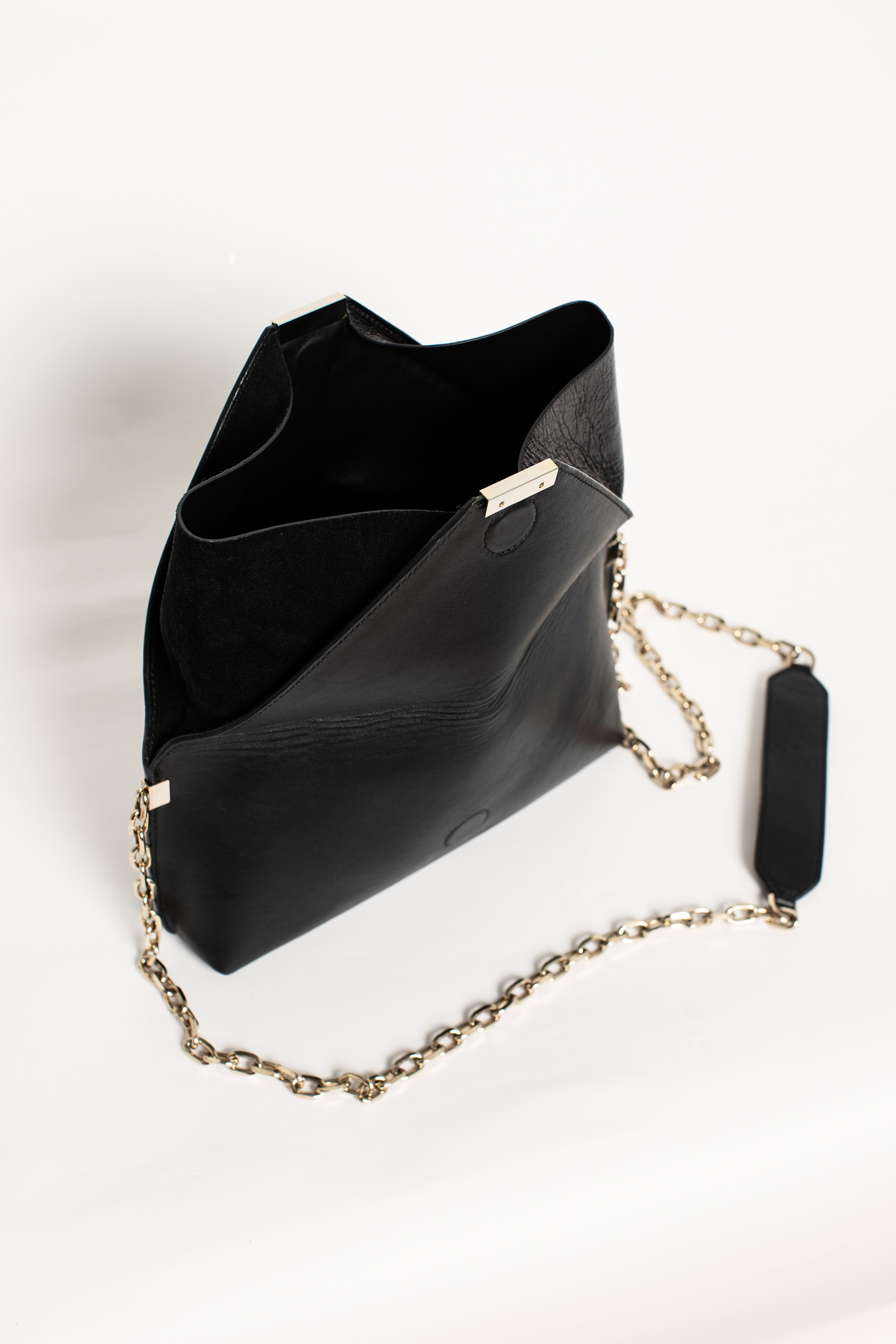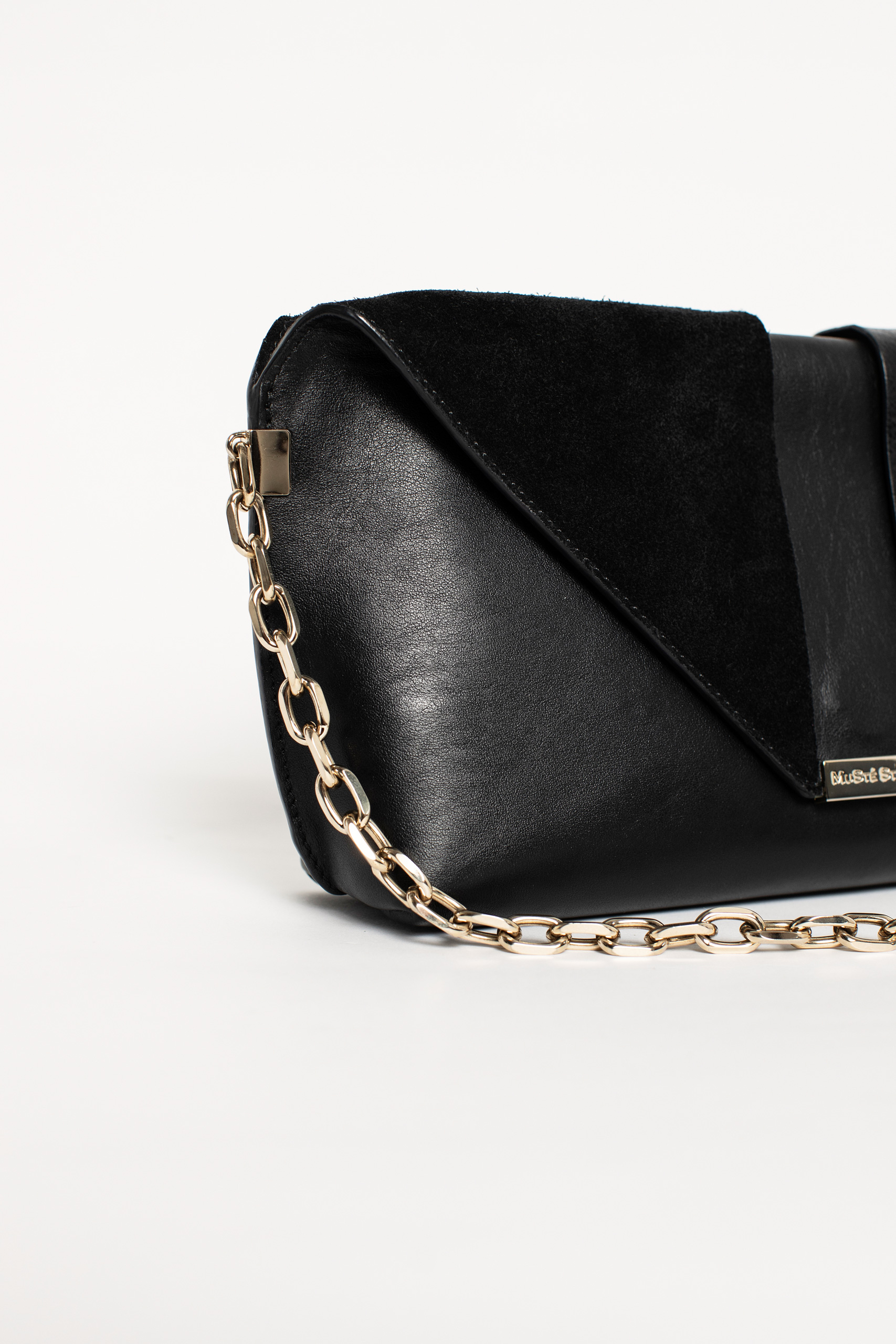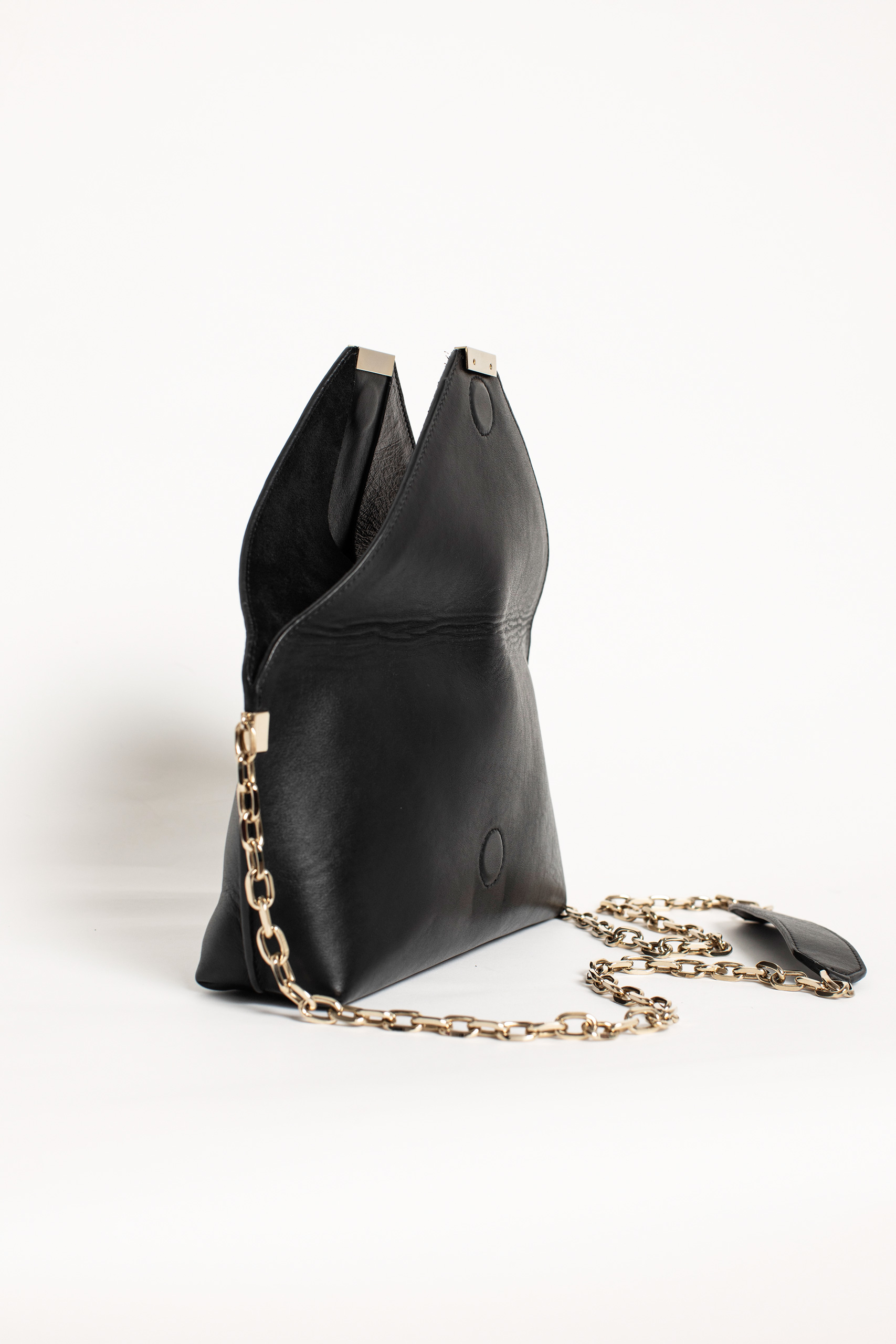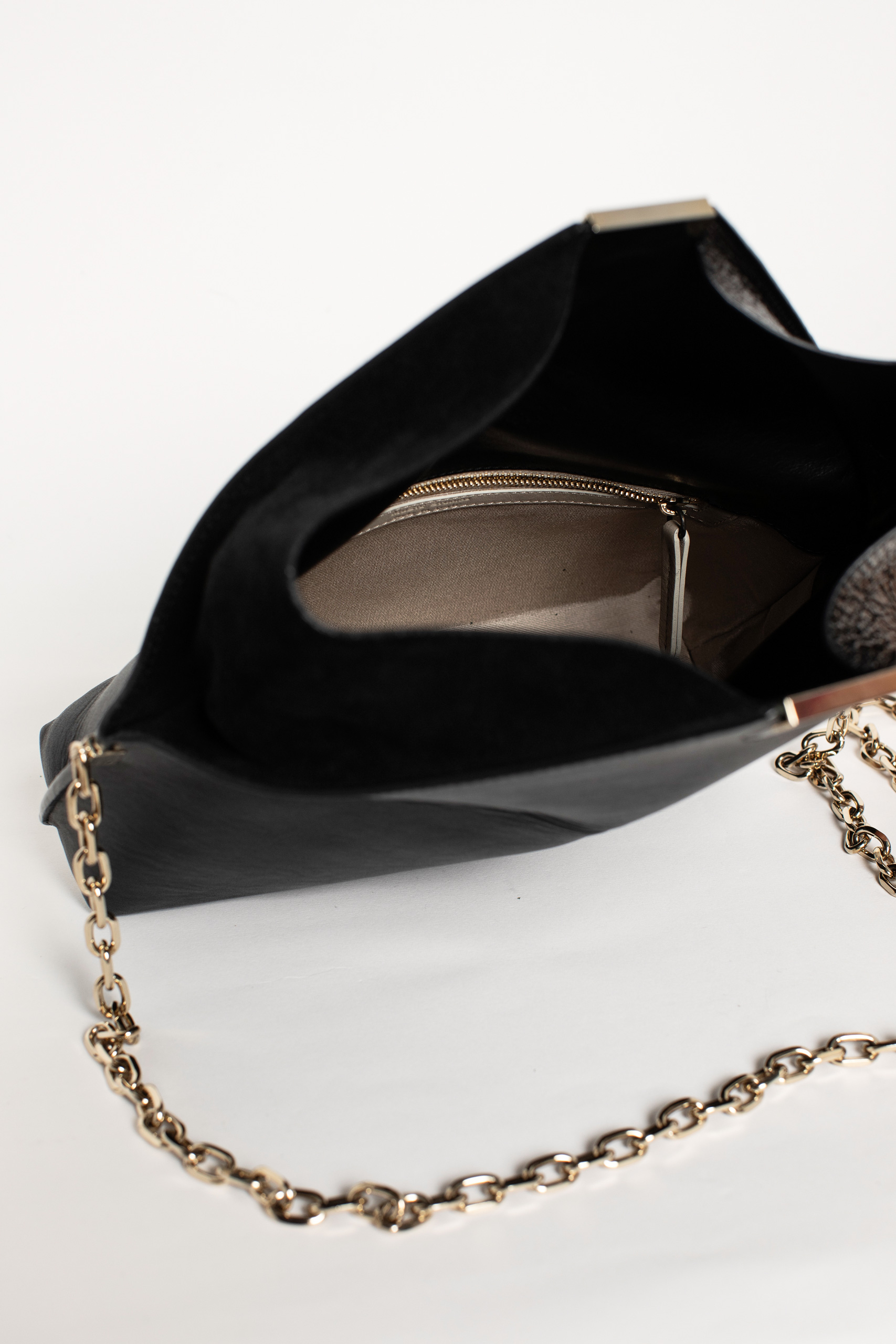 Borsa in mix di pellame dal design ispirato agli origami. Il tocco luminoso della catena tracolla e l’eleganza delle finiture color oro donano un’allure sofisticata e versatile a questa borsa mini.