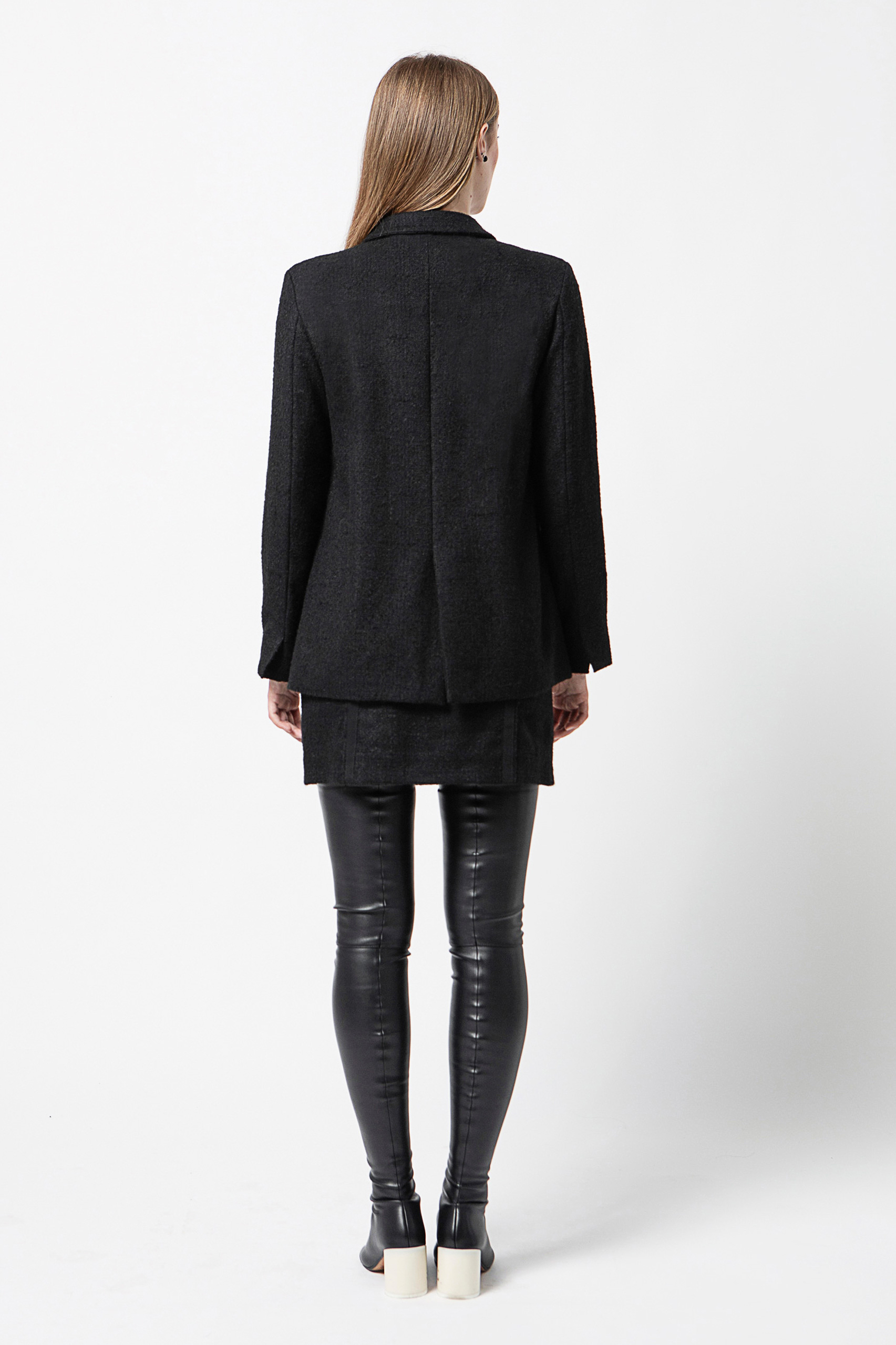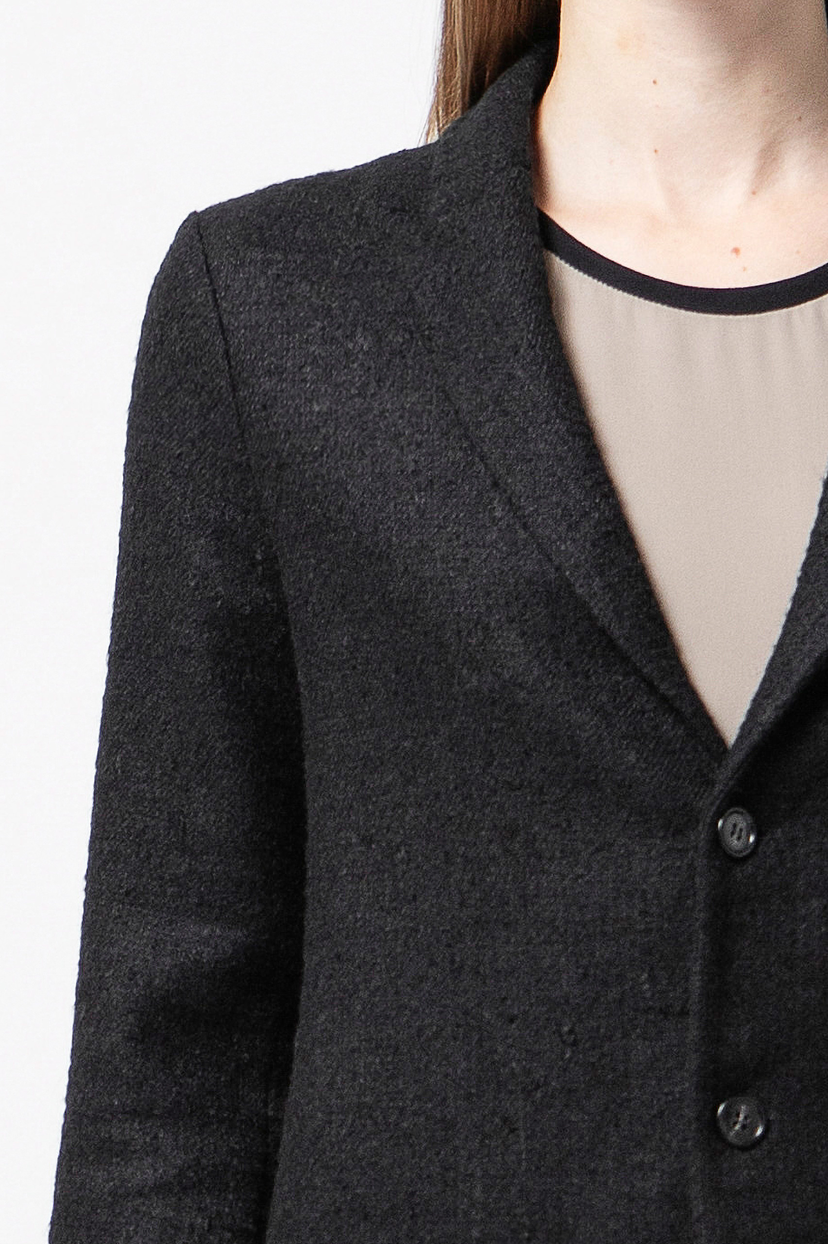 Linee essenziali definiscono la silhouette di questa giacca in lana bouclé che combina fascino contemporaneo alla decostruzione. Il design morbido è definito da tasche frontali a toppa impreziosite dall’applicazione di gros-grain in cotone.