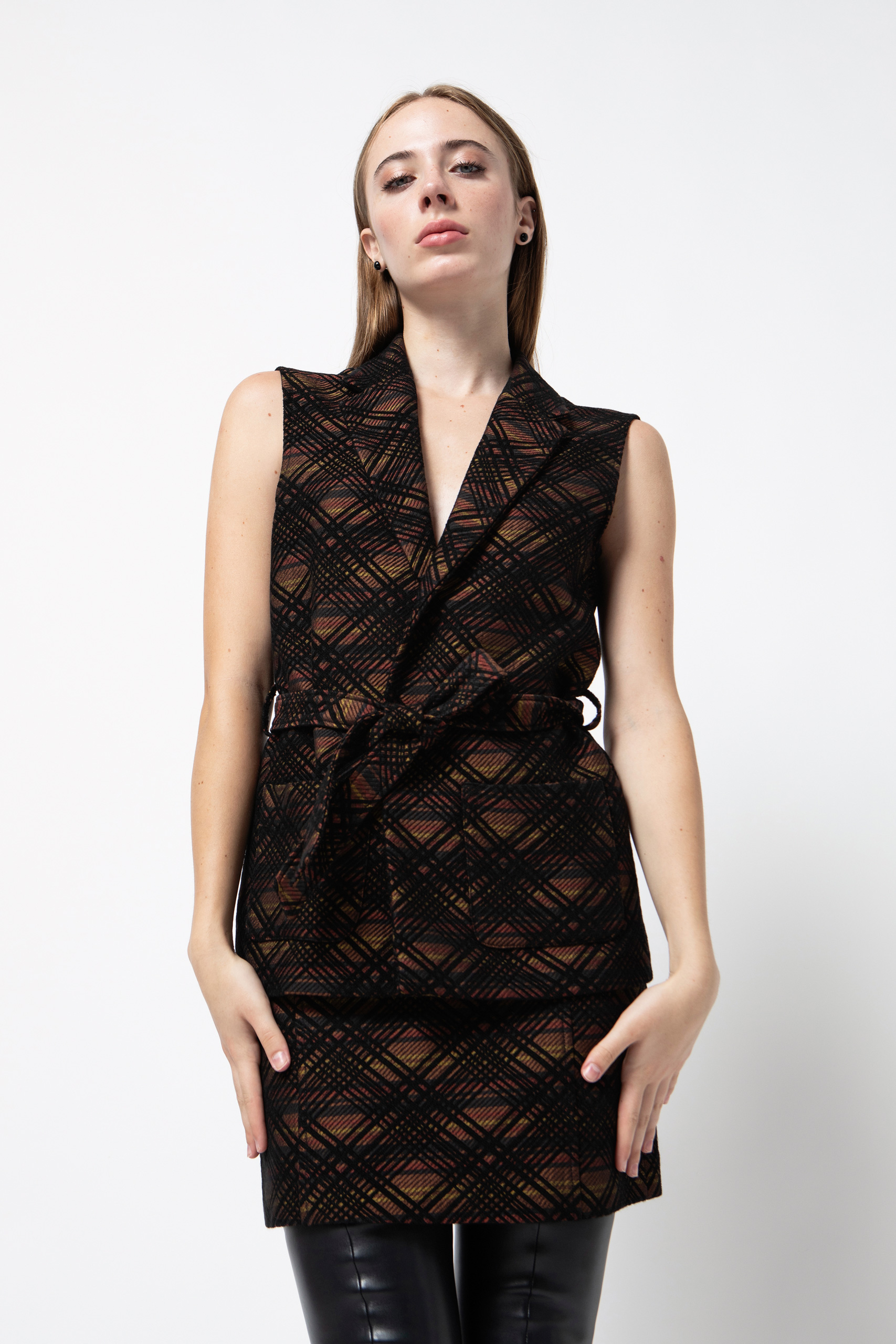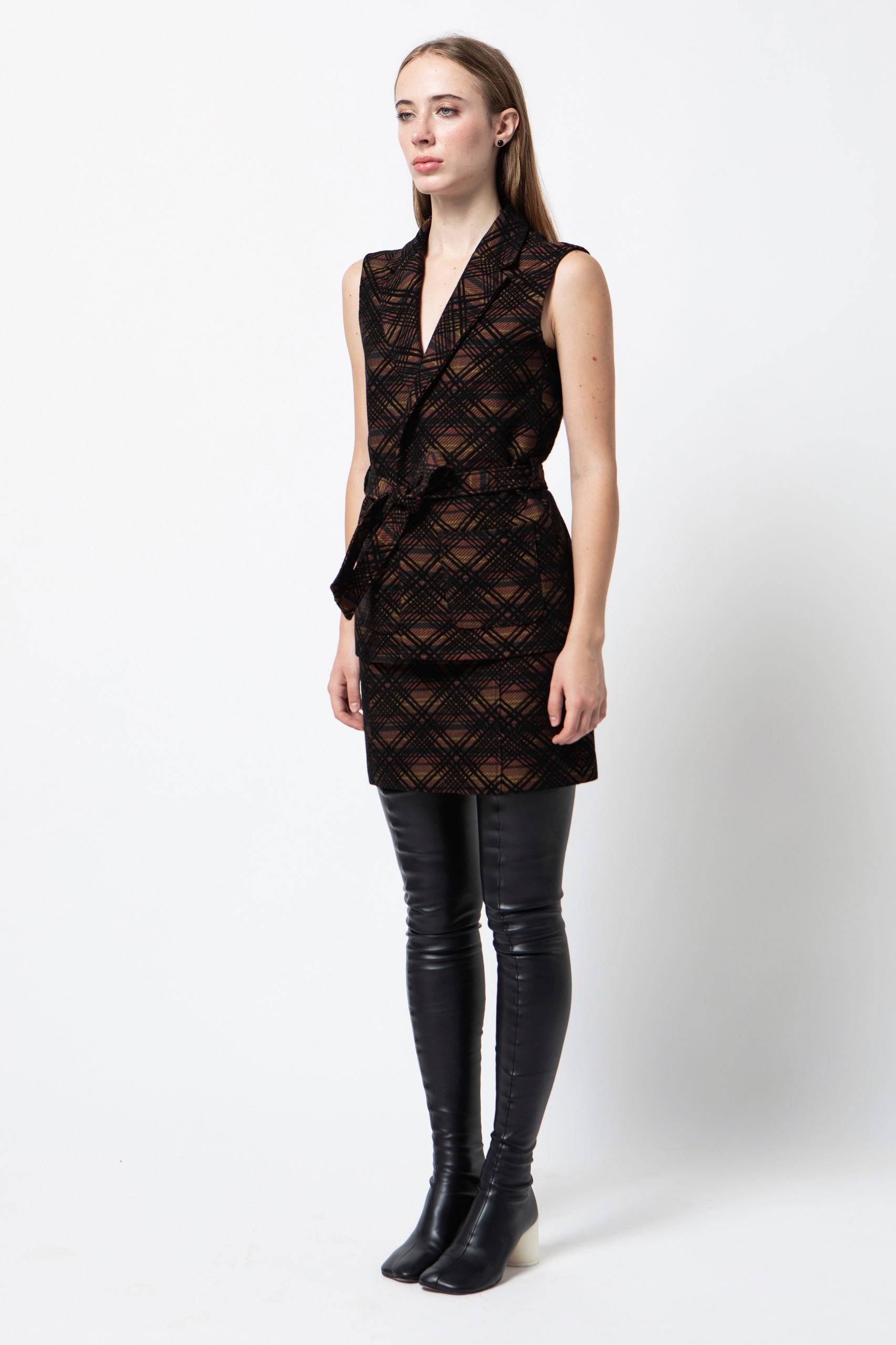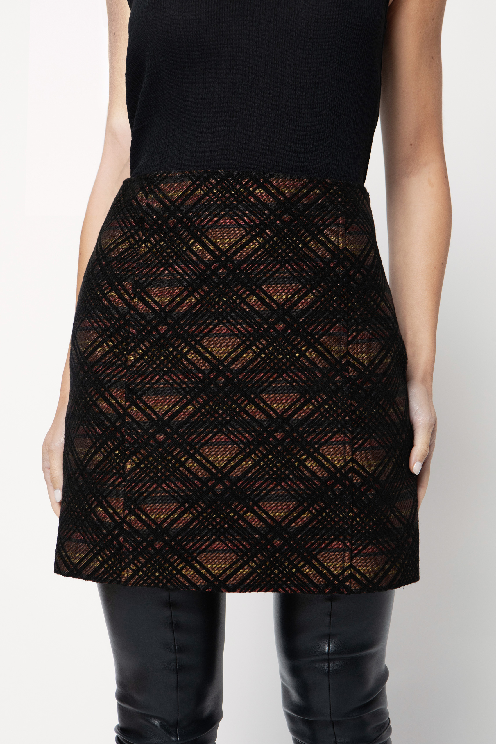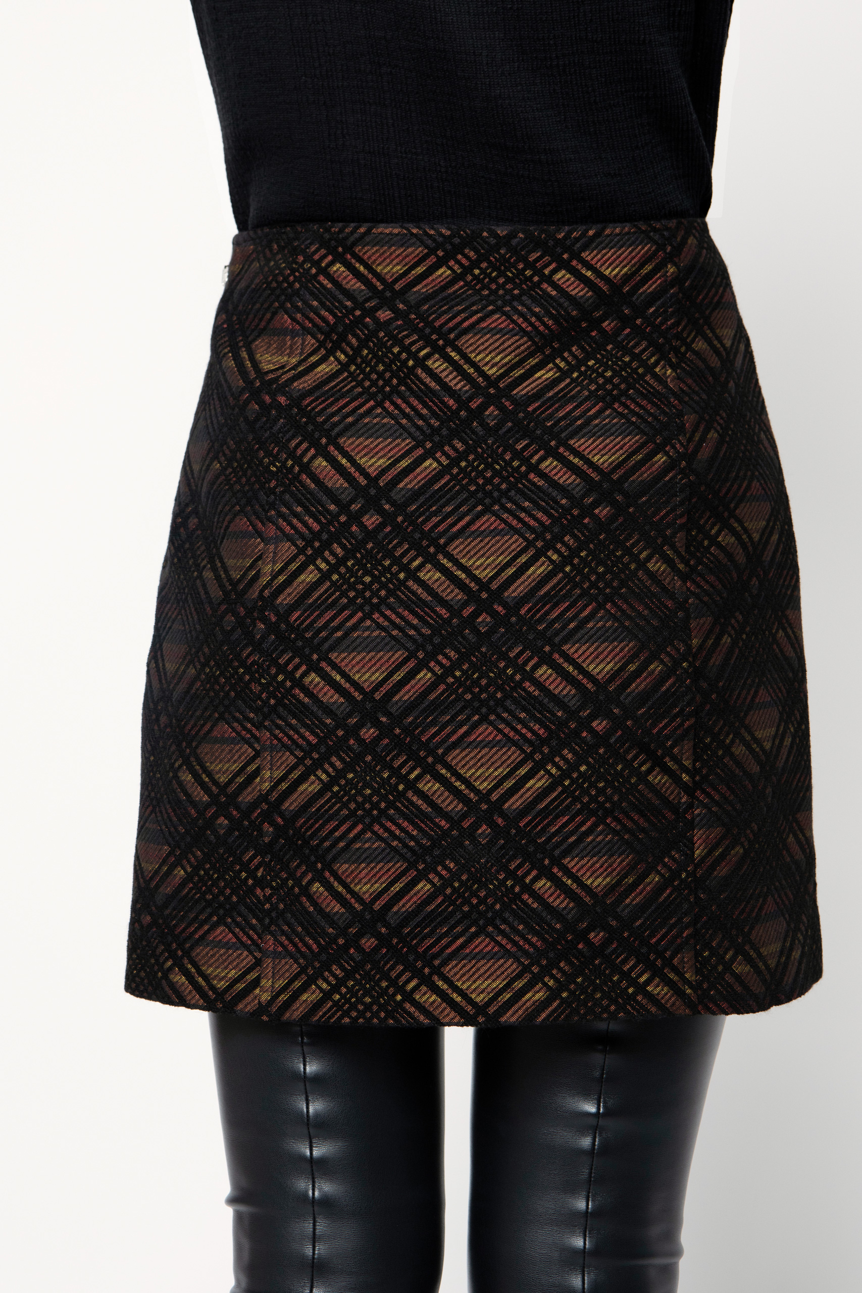 Minigonna in tessuto a quadri a tessitura jacquard dai tagli decisi e spirito contemporaneo, impreziosita da una zip di metallo sul fianco.