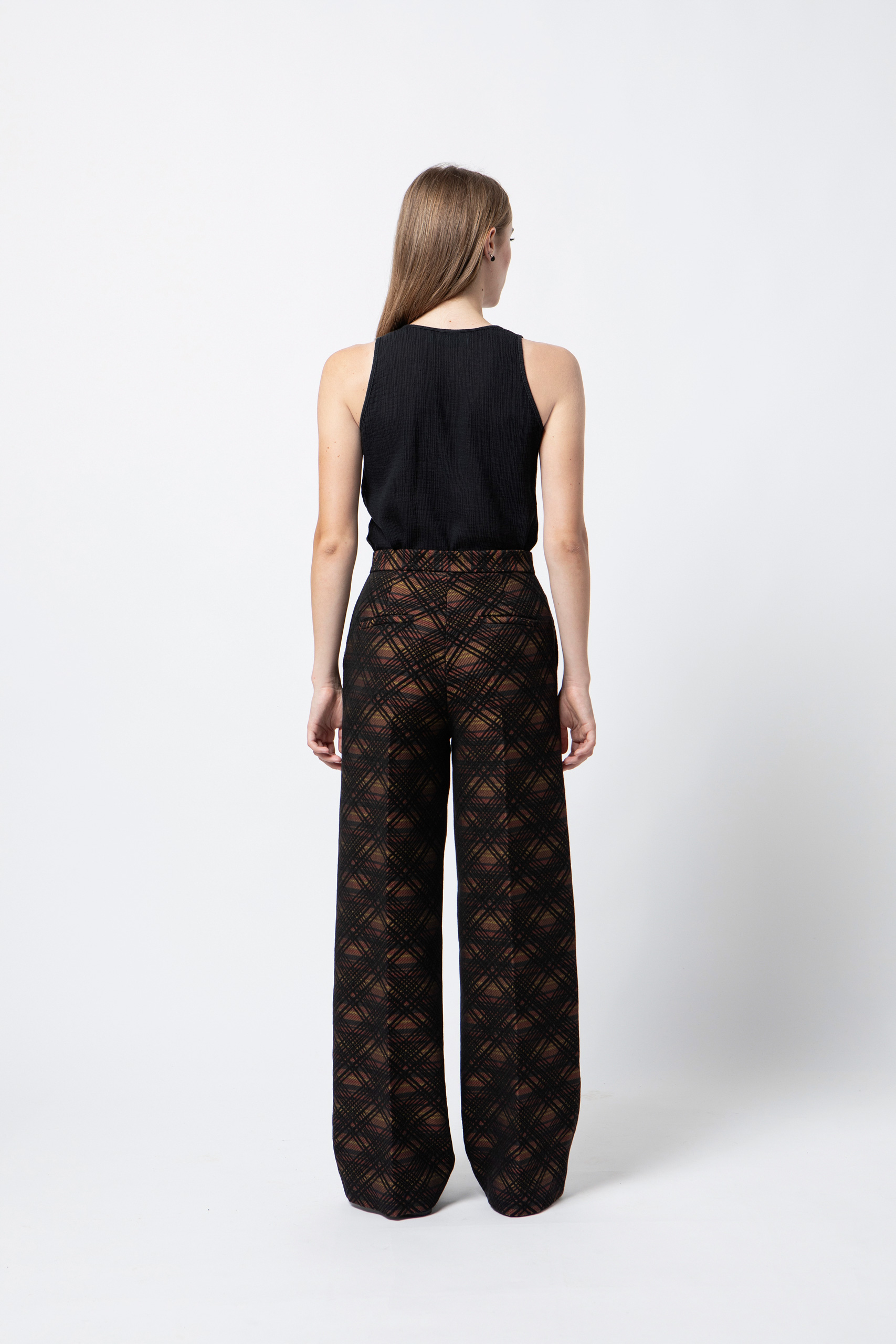 I dettagli essenziali di questi pantaloni in in tessuto jacquard a quadri lasciano spazio alla ricercatezza del taglio sartoriale d’ispirazione maschile. La silhouette classica è enfatizzata da linee pulite e proporzioni over che introducono un tocco contemporaneo e sofisticato.